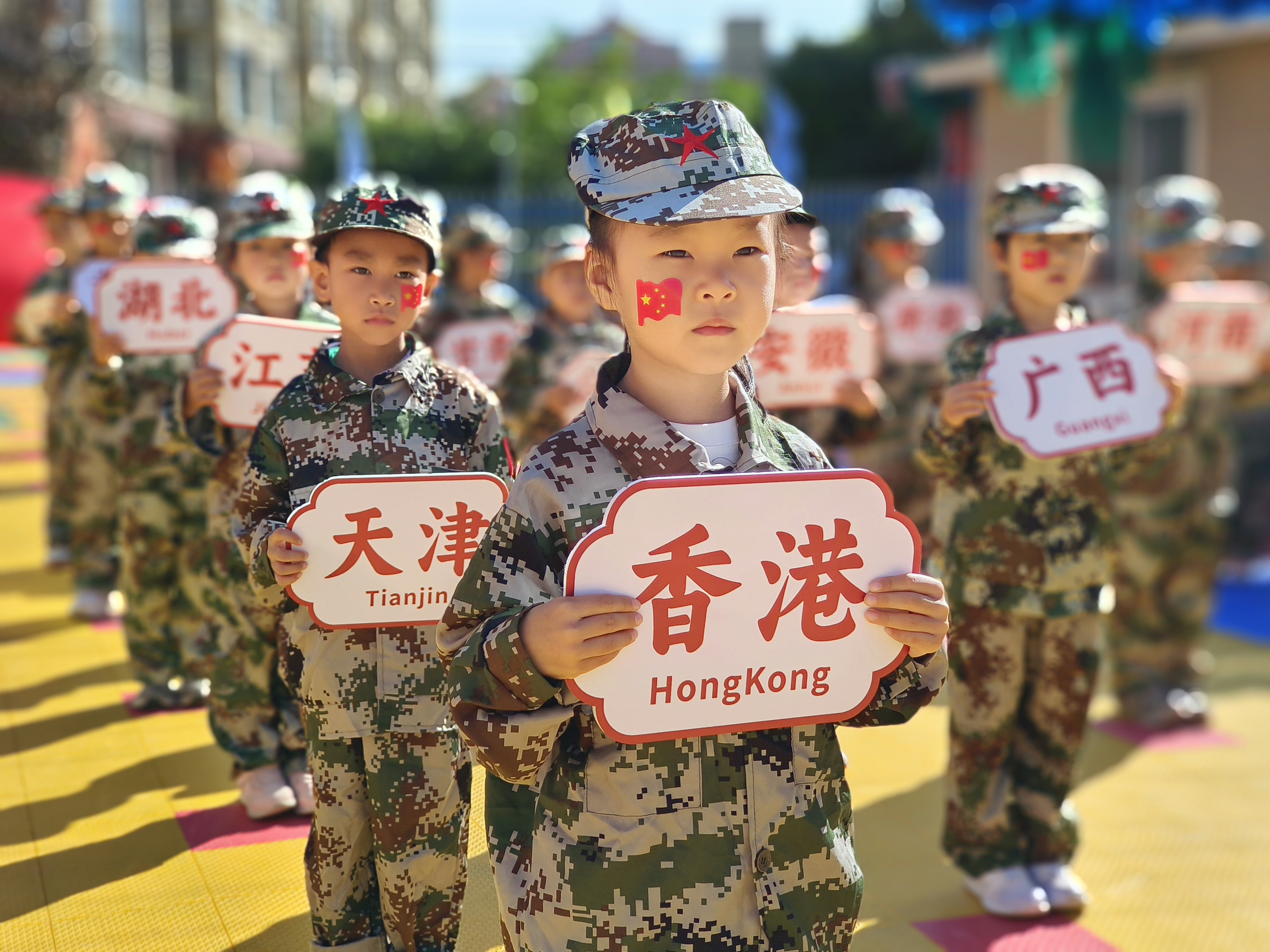 在“大美祖国”活动环节,萌娃们在五星红旗下,手握我国各省、自治区、直辖市的名牌,按照老师的点名逐一喊“到”。当“中国台湾”小朋友被点名时,孩子们齐声高喊“一个也不能少。”这项活动不仅让孩子们认识了更多汉字,也懂得了祖国统一的重大意义。